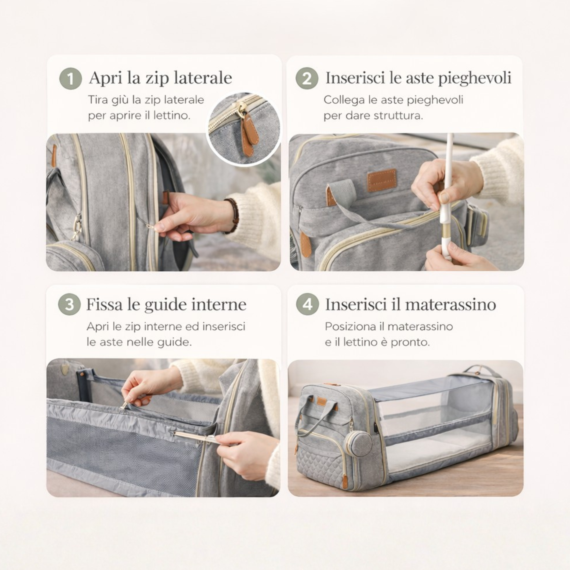 Lo zaino si trasforma facilmente in un pratico lettino portatile. Perfetto per il cambio pannolino o per far riposare il bambino in modo sicuro ovunque ti trovi.